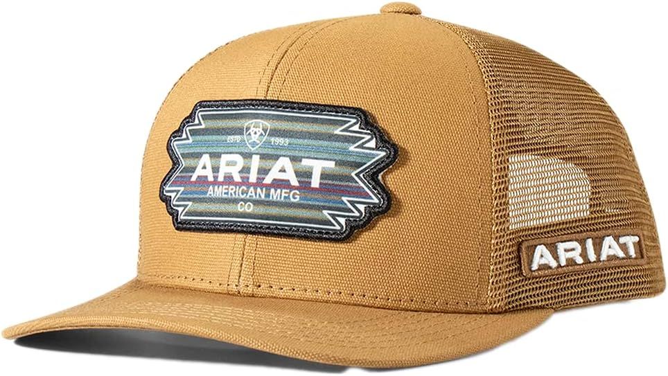 Top it off with this baseball cap from Ariat by M&F Western. This hat has a gold mesh back with snap closure. The solid gold front panels have a logo patch with the words “ESTD 1993 Ariat American MFG Co.” 100% cotton.